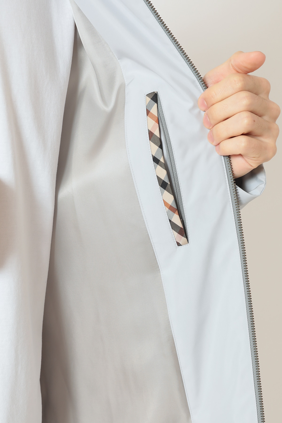 高密度タフタ素材「H2OFF」を使用し、優れた撥水性を実現。薄手の中綿(パディング)を入れることで、春先の肌寒さを防ぐ保温性と、軽やかな着心地を両立させました。