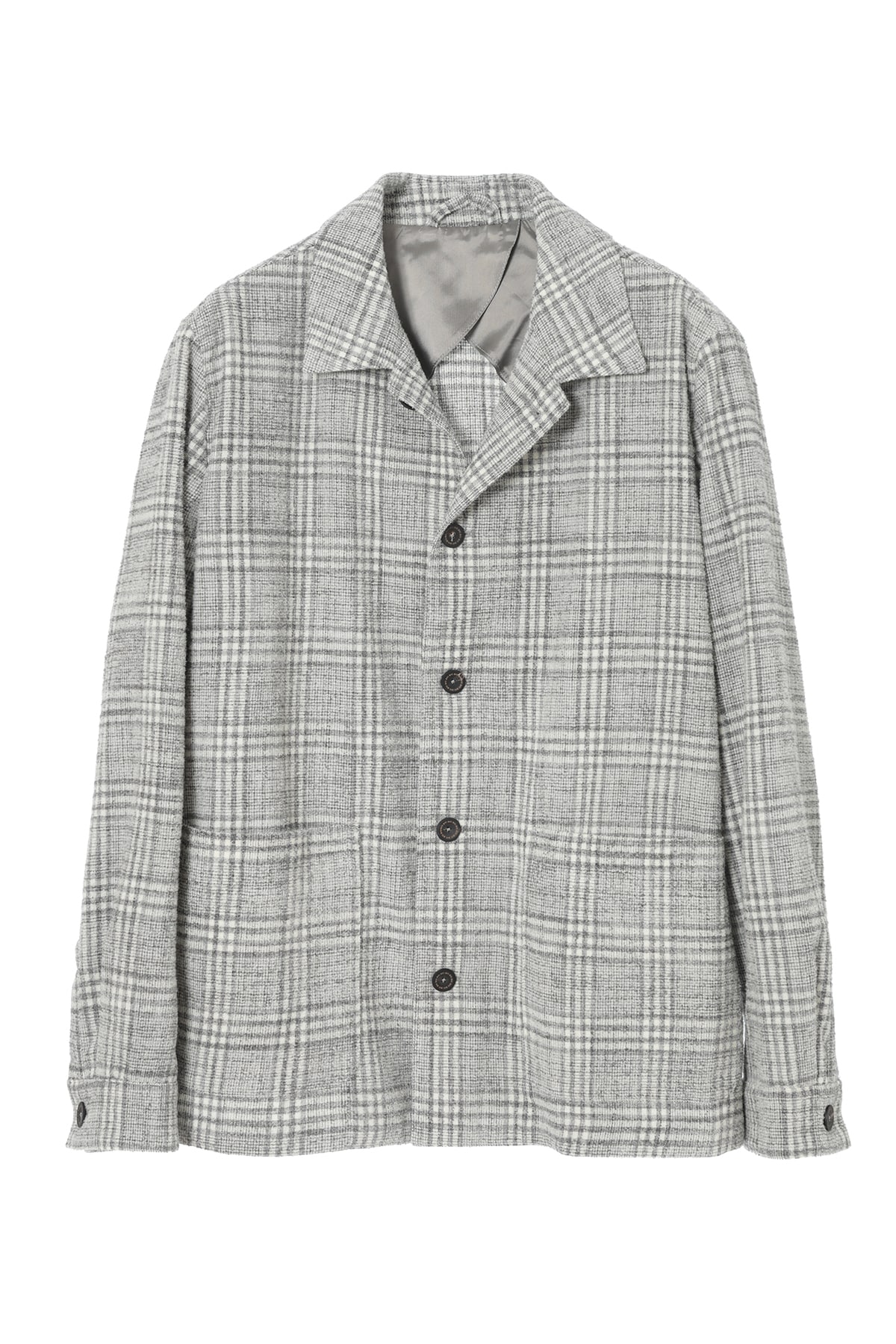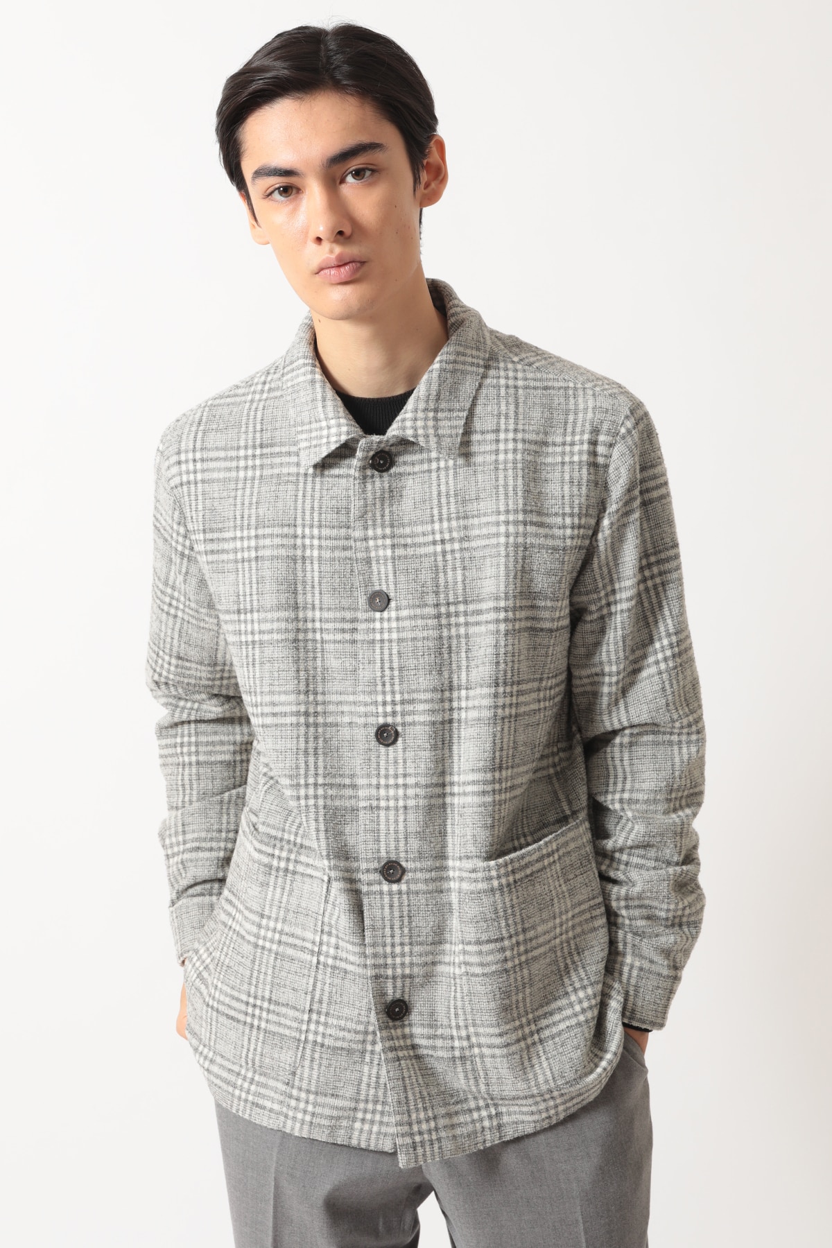 イタリアのドラゴ社が開発した、軽やかでふんわりとしたウール混生地を使用したテーラードオーバーシャツです。エレガントなグレーチェック柄と、ウールの柔らかな風合いが、上品な着こなしを演出します。洗練されたワークウェアにインスパイアされたデザインは、2つのパッチポケット、5つボタンの前立て、ワンピースカラー、ボタン付きカフスといったディテールが特徴です。快適な着心地を追求した半裏仕様で、ブレザーに代わるモダンでスマートなシルエットに仕立てられています。カジュアルでありながら品格のある、大人のためのモダンなアウターシャツです。