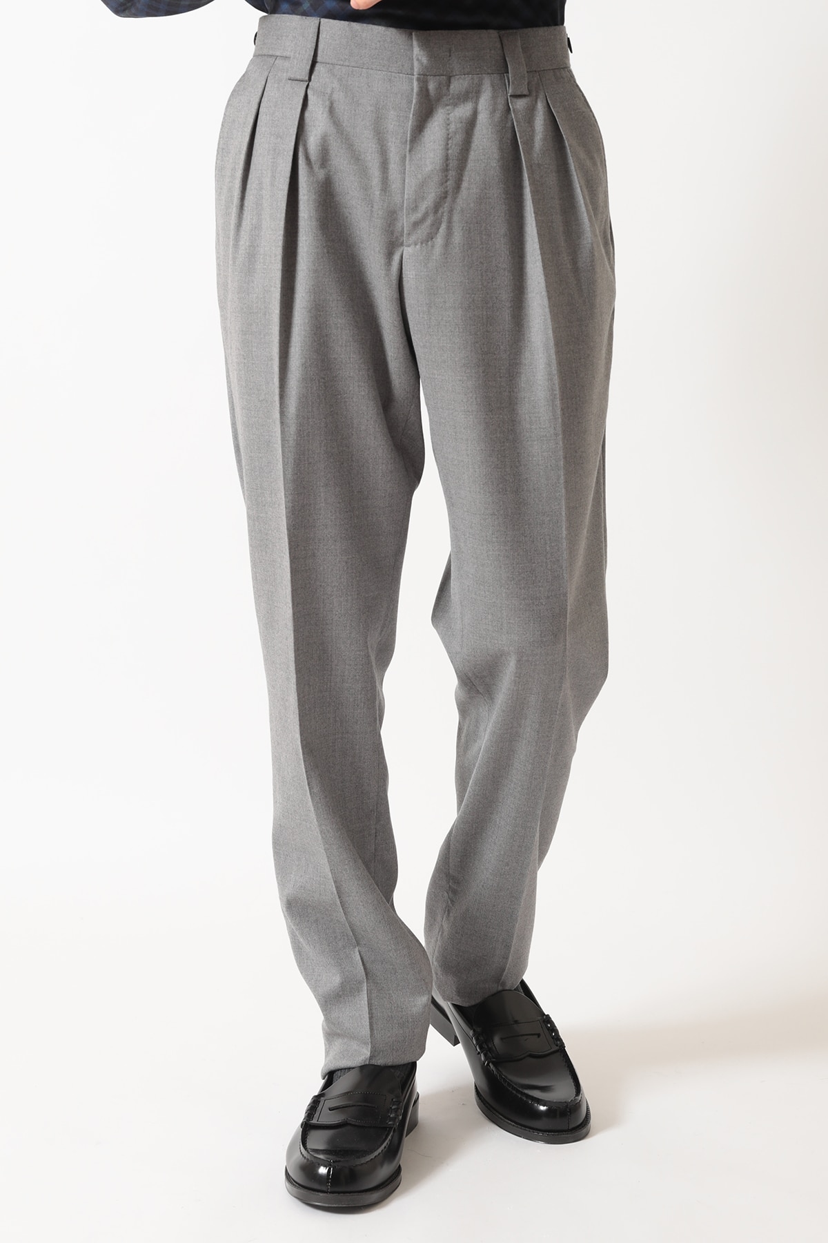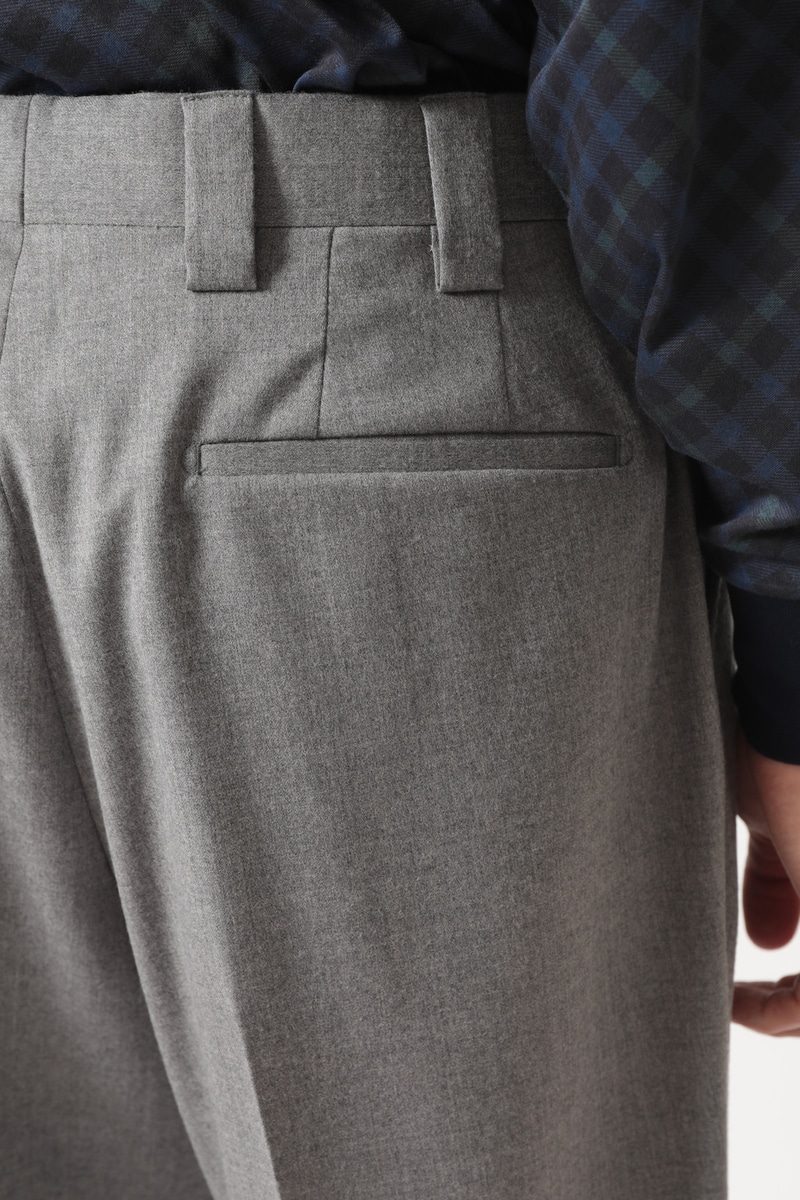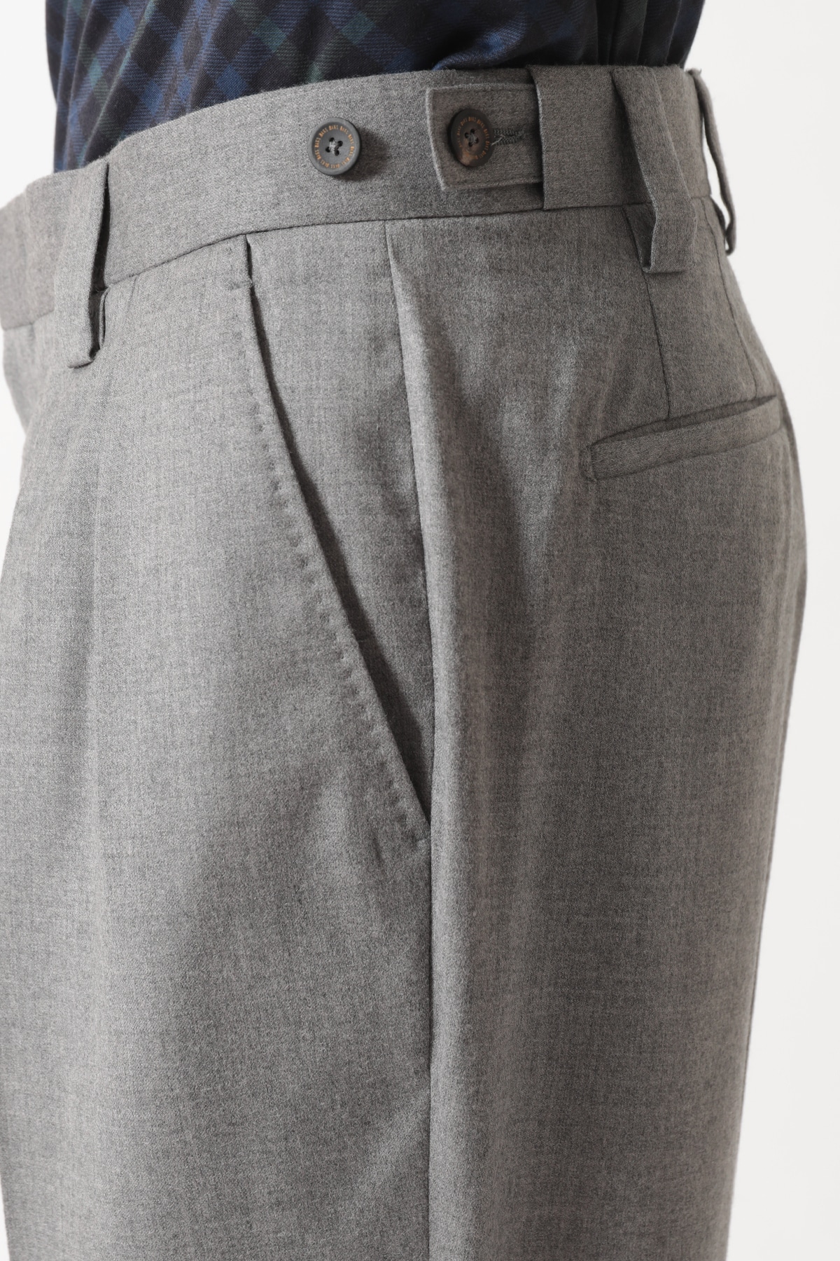 DAKSのアーカイブからインスピレーションを得て、モダンに再構築された4タックパンツです。イタリアのラダ社による軽量フランネル生地を使い、イタリアで丁寧に仕立てました。深めのライズと、エレガントなテーパードシルエットが特徴で、クラシックな風格と現代的な穿き心地を両立しています。快適さを高める膝までの半裏地付き。ディテールにもこだわり、ウエストにはDAKS TOPアジャスター、フック留め具、後部のウェルトポケット、エコホーンボタンを採用しています。DAKSらしい伝統と革新を感じさせる、上質な一着です。