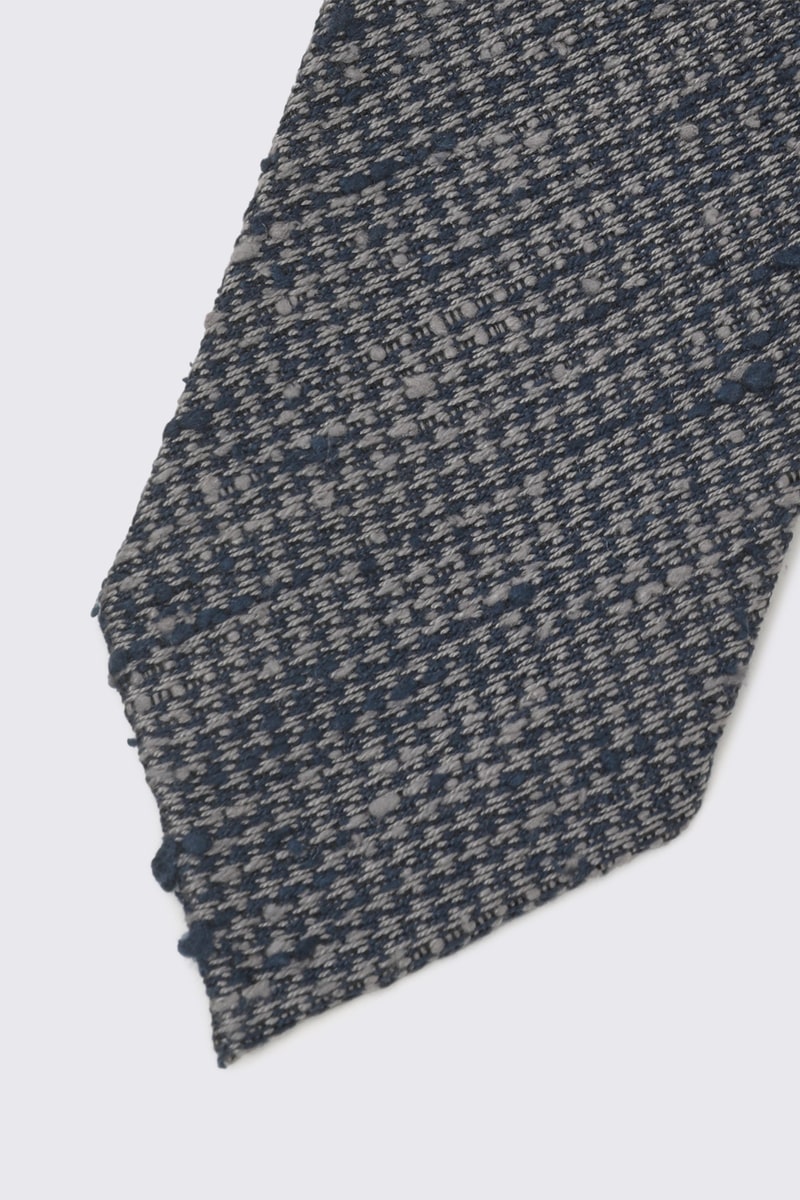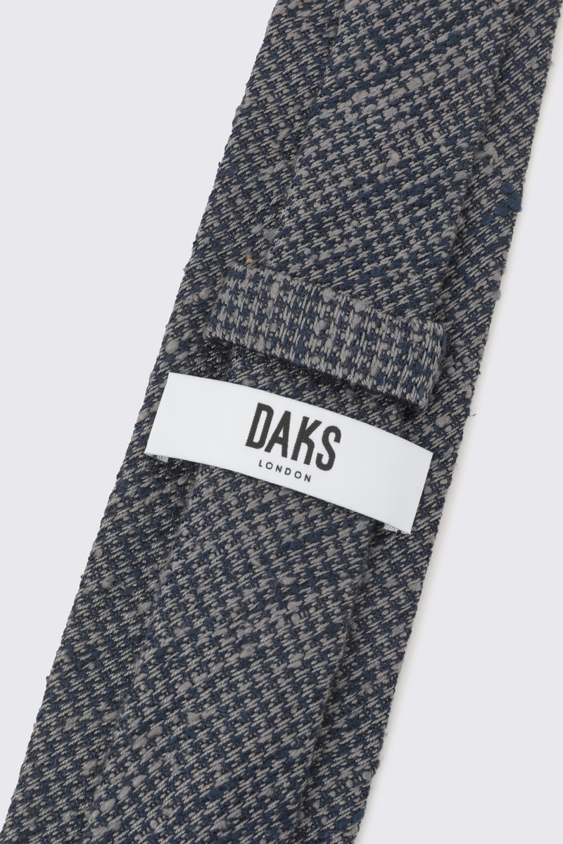 素材は上質なシルク100%でありながら、ツイードやウールのような温かみのある千鳥格子柄(ハウンドトゥース)の織りによって、独特の立体感と重厚感を表現しています。シックなカラーリングに、ところどころに見られるネップ(色の濃い節)がアクセントとなり、カントリーテイストな雰囲気を演出します。通常のシルクタイにはない、ざっくりとした風合いは、フランネルやツイードなどの秋冬のジャケットスタイルと抜群の相性を発揮します。DAKSらしいブリティッシュなクラシックさと、現代的な洗練さを兼ね備えた一本。