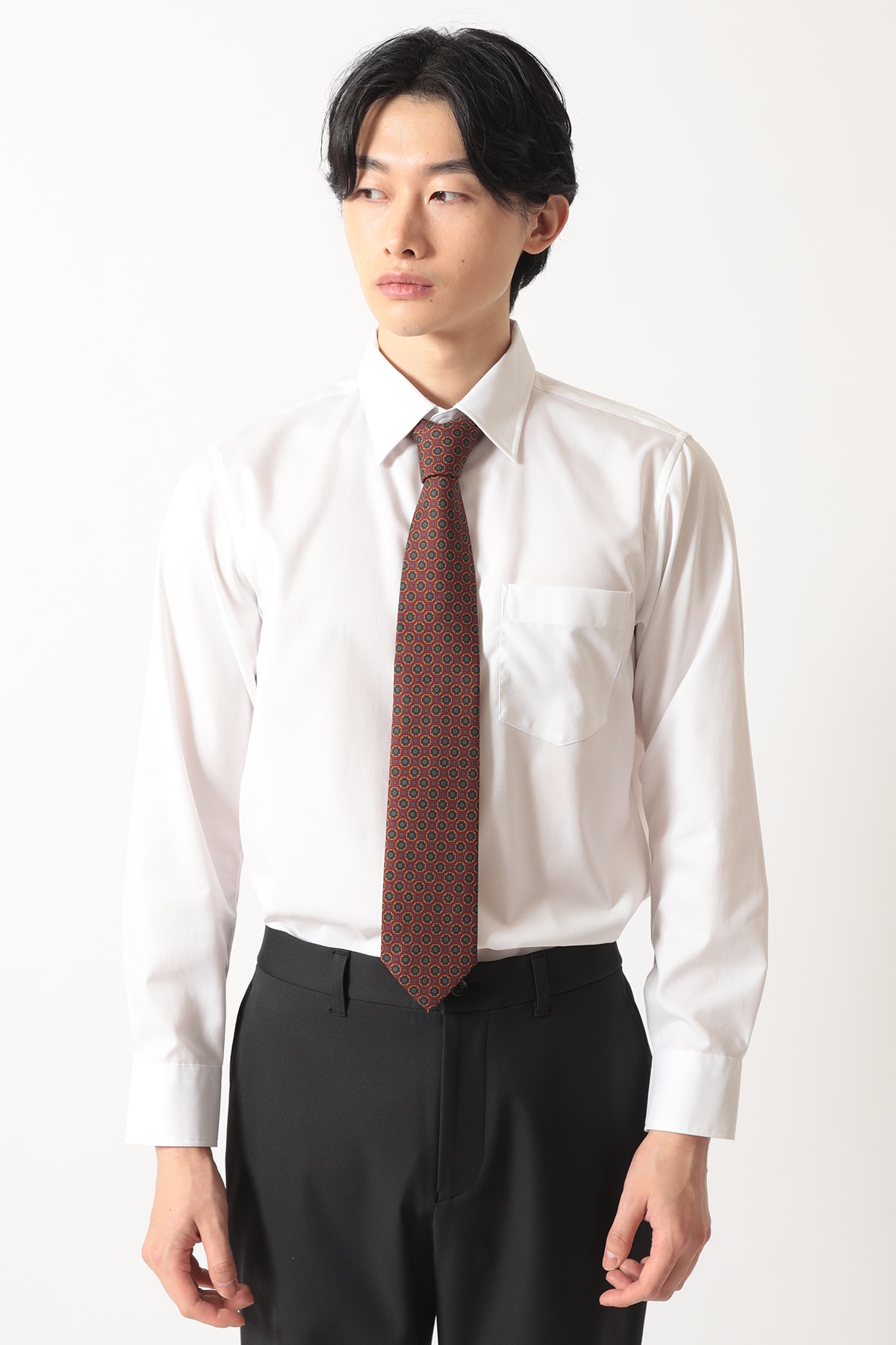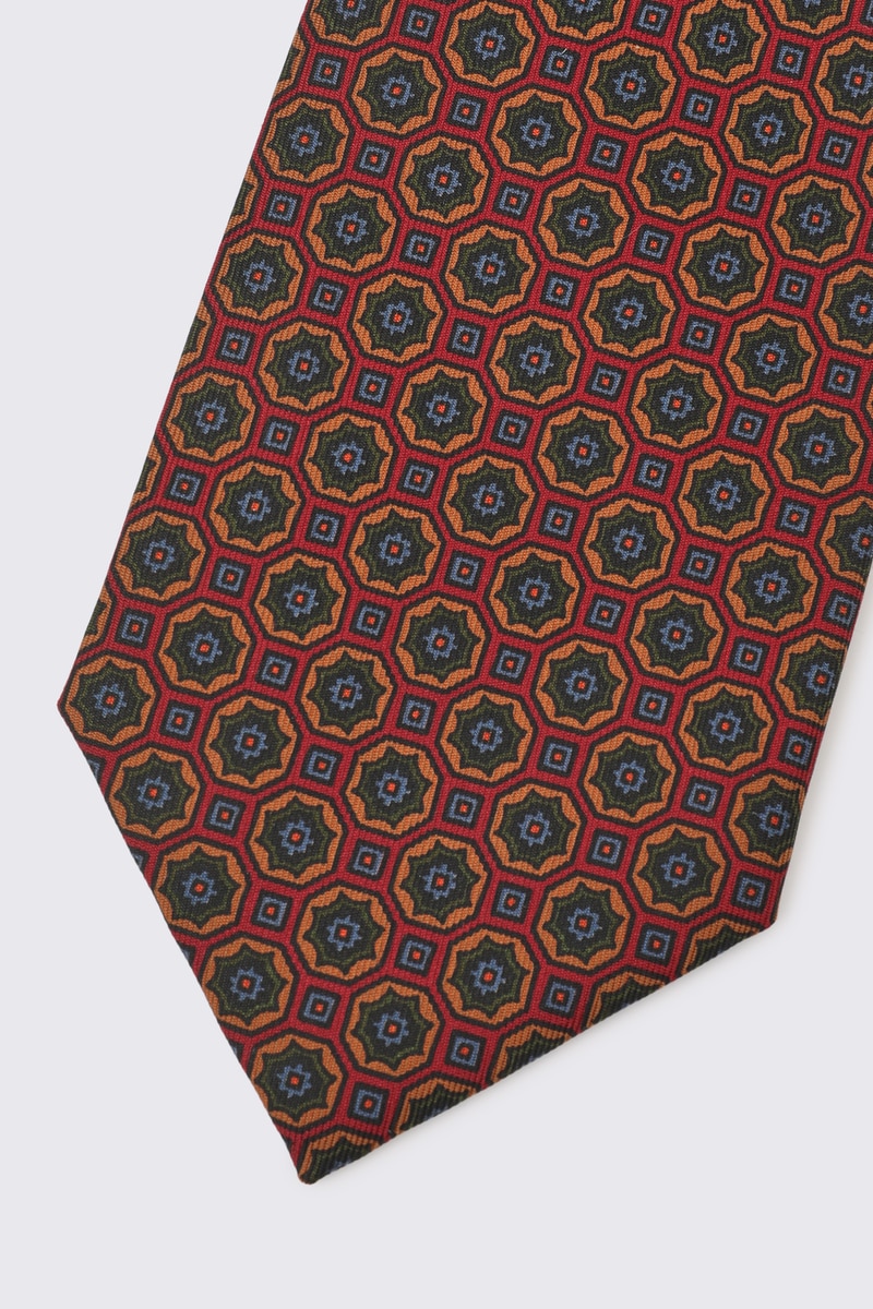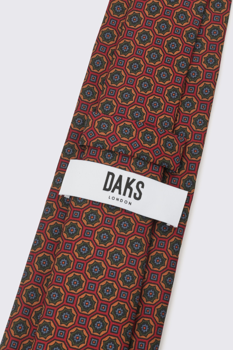 ベースカラーのボルドー(赤茶)に、オレンジ、ブルー、オリーブなどの複数の色を用いた伝統的な小紋柄(マイクロパターン)が織り込まれています。遠目にはシックなトーンでありながら、近くで見ると豊かな色彩と立体感が楽しめ、 Vゾーンに深みと華やかさを与えます。素材は光沢とドレープ性に優れたシルク100%。上質なシルクが、ノット(結び目)を美しく引き立たせ、締め心地の良さと型崩れのしにくさを両立しています。クラシックなスーツスタイルはもちろん、無地のジャケットやシャツに合わせるだけで、格調高いブリティッシュトラッドなスタイルを完成させる一本です。