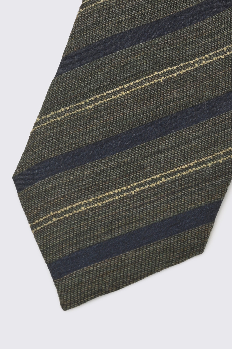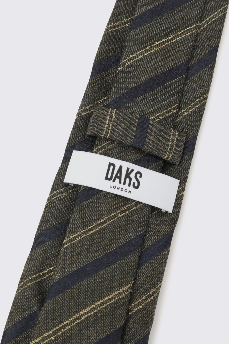 ウール混ならではのざっくりとした温かみのある風合いが特徴。ベースのオリーブグリーンに、ネイビーとイエローのストライプを配し、独特の重厚感と表情豊かな奥行きを生み出しています。シルクの光沢を抑え、ざらつきのあるラフな織りを採用することで、フランネルやツイードなど、季節のジャケットスタイルと抜群の相性を発揮。DAKSらしい英国トラッドなスタイルを、モダンで洗練された印象に格上げします。