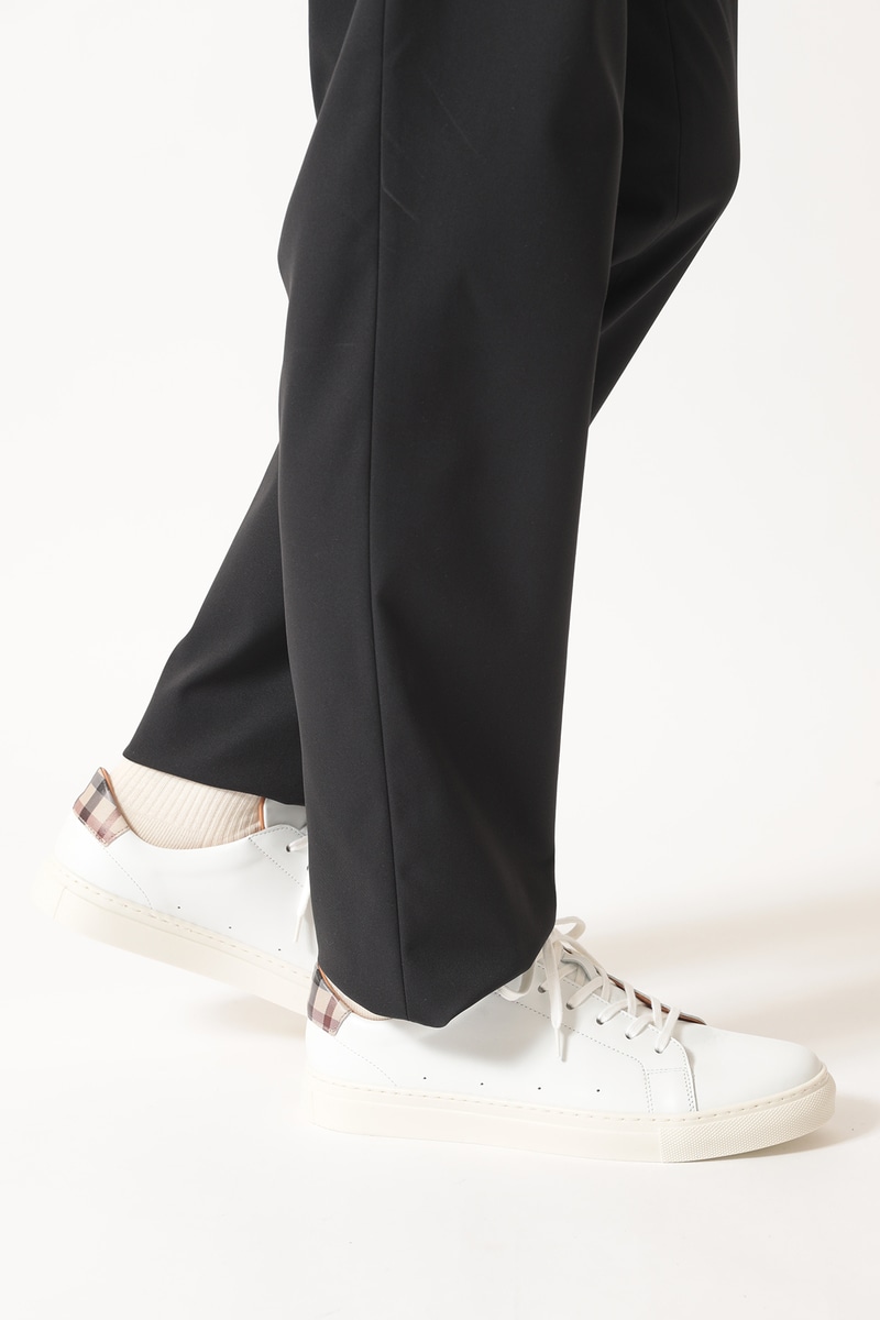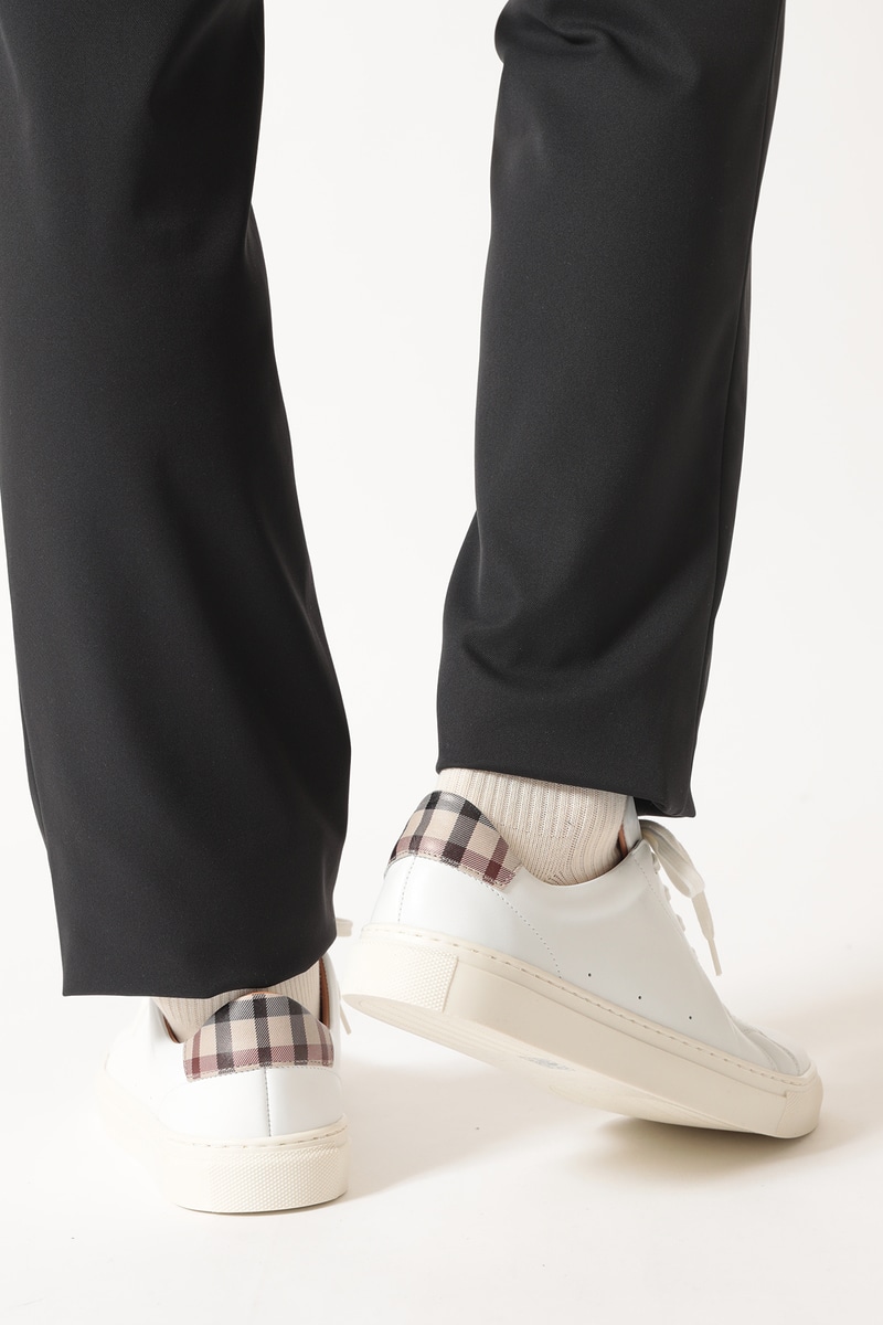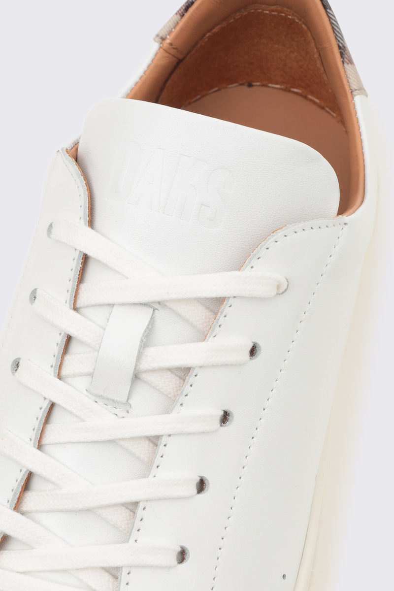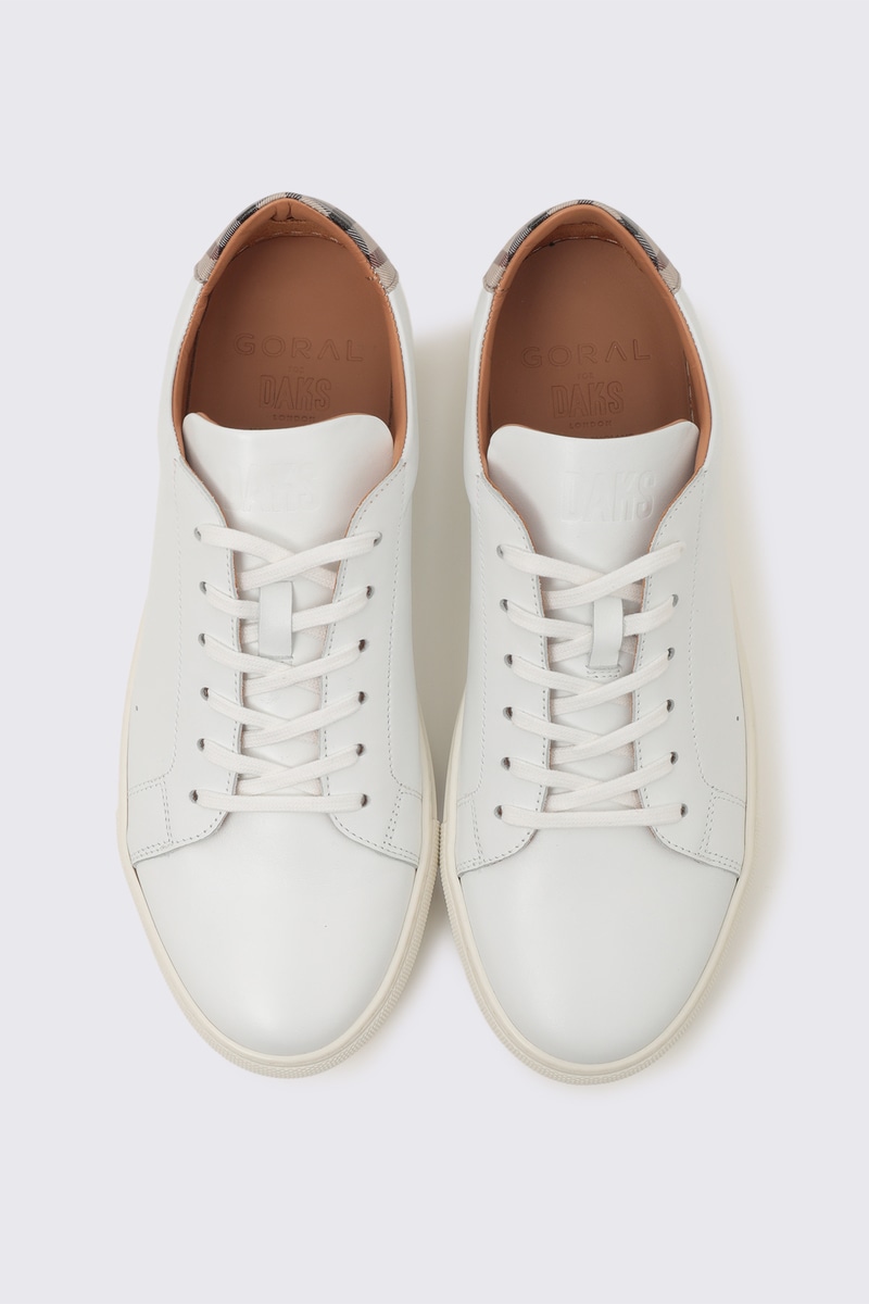 アッパーは滑らかで柔らかな牛革を使用し、クリーンなホワイトカラーで統一。タンにはブランドロゴが型押しされています。最大の特徴は、ヒール部分にあしらわれたDAKSハウスチェック柄。さりげないアクセントが、カジュアルなスニーカーに格調高さをプラスします。インソールには「GORAL FOR DAKS LONDON MADE IN ENGLAND」の文字が刻印されており、イギリスのクラフトマンシップを感じさせます。クッション性に優れた合成ゴムソールが快適な履き心地を提供し、きれいめからカジュアルまで、幅広いスタイルに対応する一足です。