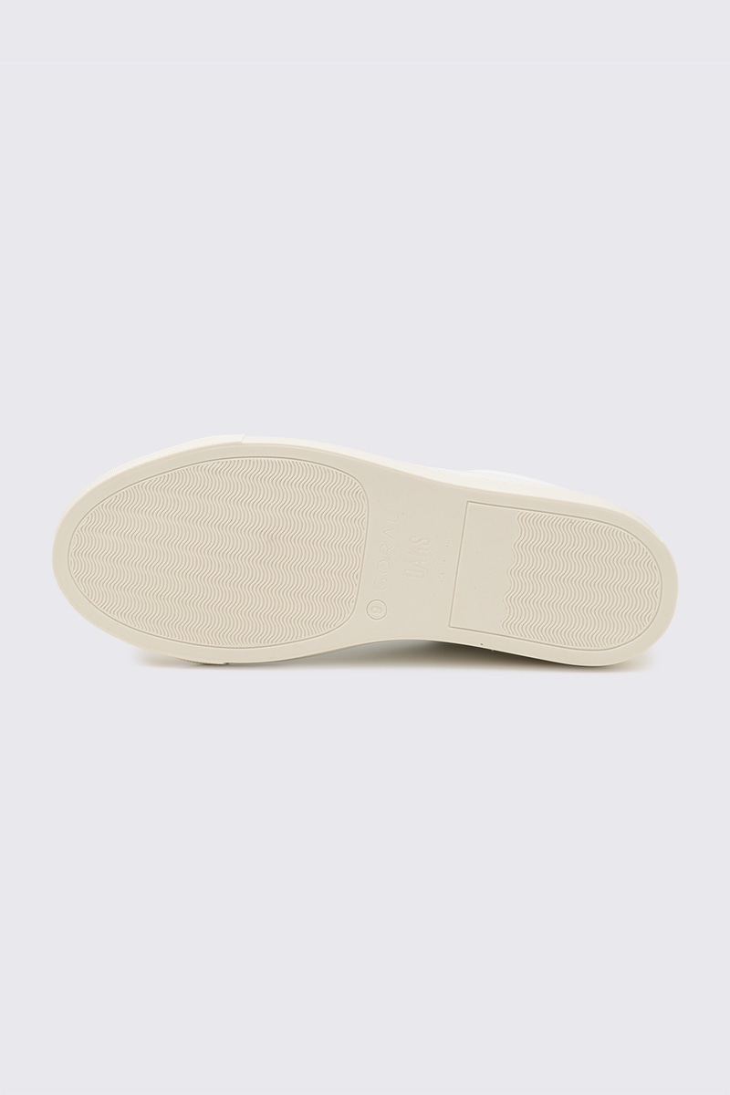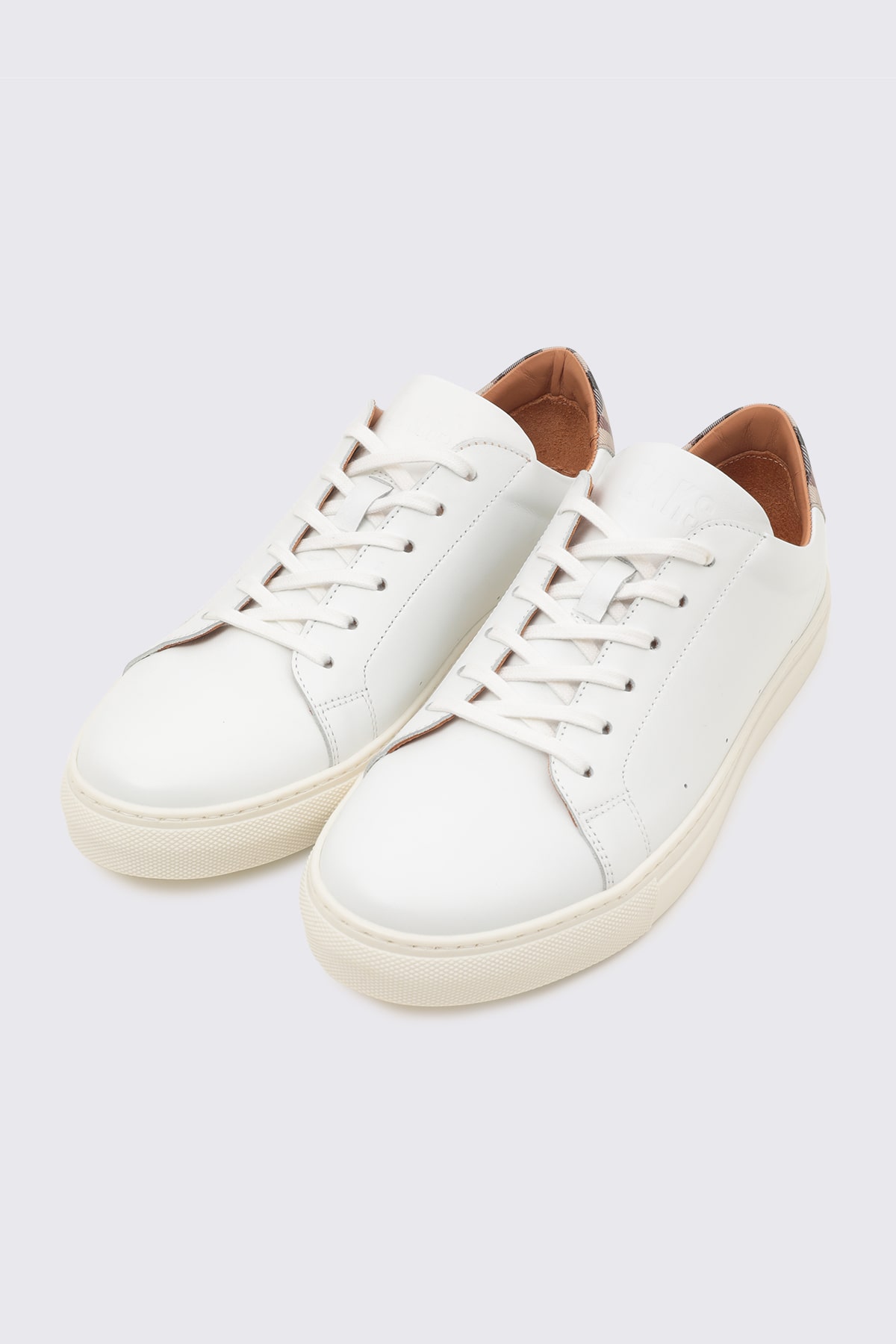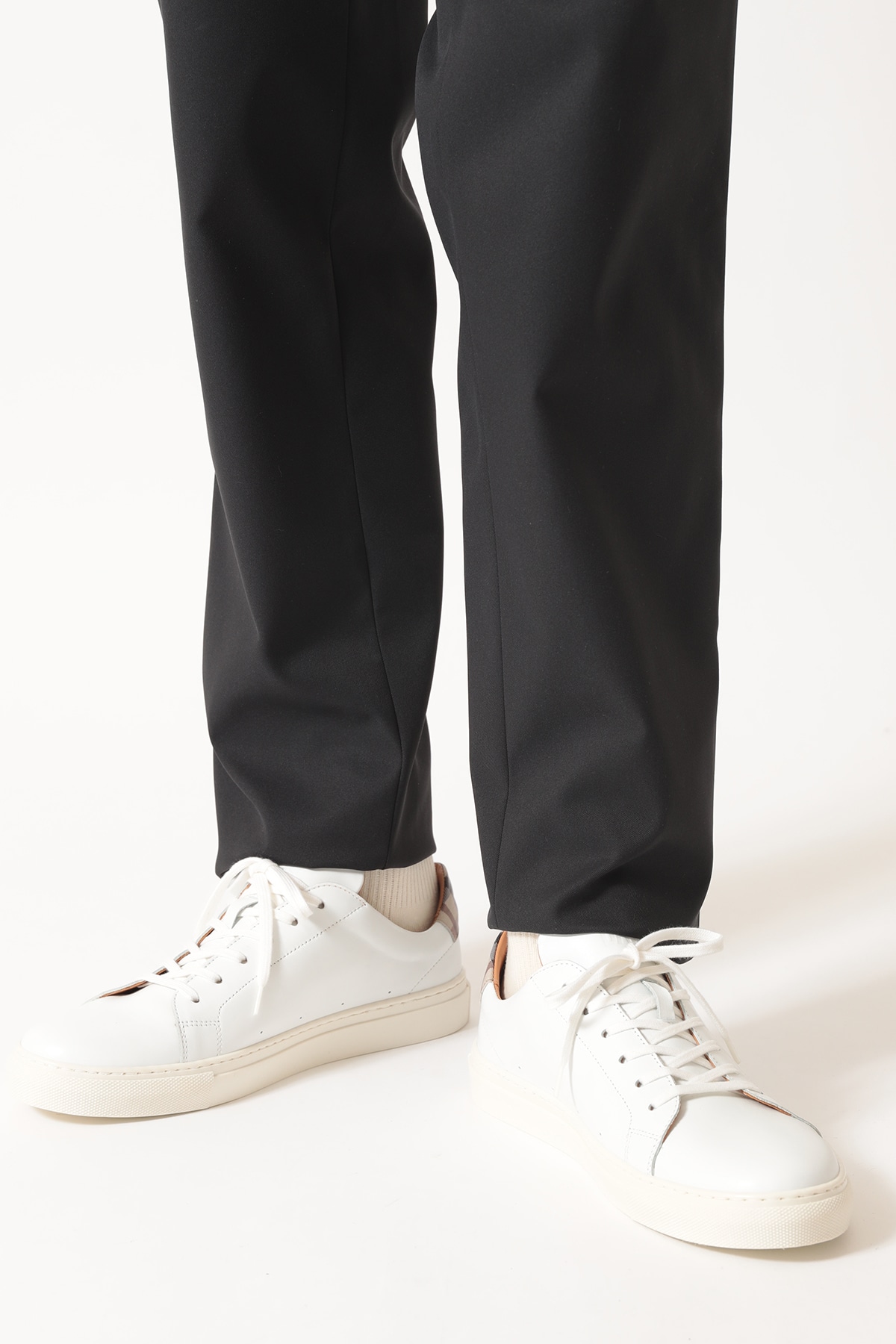 アッパーは滑らかで柔らかな牛革を使用し、クリーンなホワイトカラーで統一。タンにはブランドロゴが型押しされています。最大の特徴は、ヒール部分にあしらわれたDAKSハウスチェック柄。さりげないアクセントが、カジュアルなスニーカーに格調高さをプラスします。インソールには「GORAL FOR DAKS LONDON MADE IN ENGLAND」の文字が刻印されており、イギリスのクラフトマンシップを感じさせます。クッション性に優れた合成ゴムソールが快適な履き心地を提供し、きれいめからカジュアルまで、幅広いスタイルに対応する一足です。