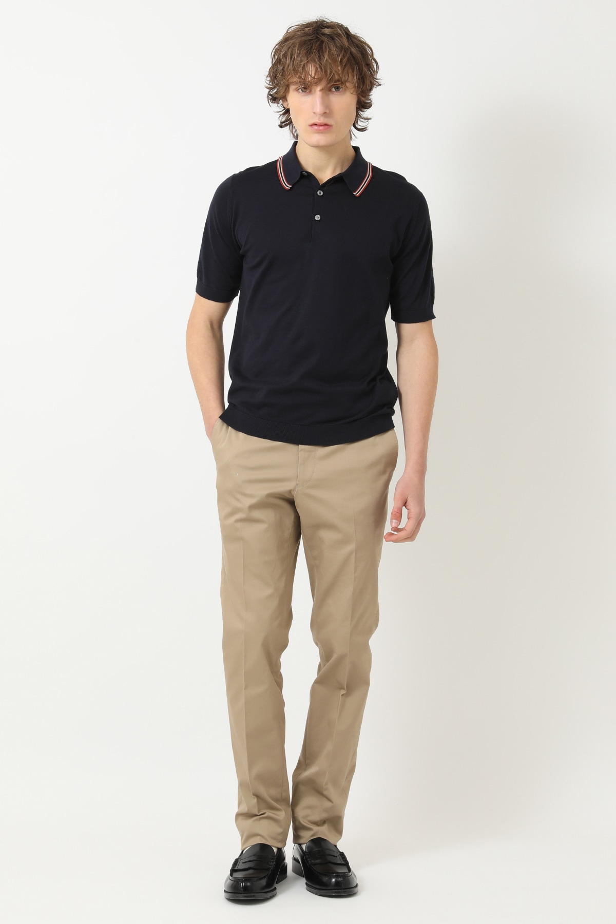 英国王室御用達のジョンスメドレーとDAKSのコラボレーションを象徴する、コットンポロシャツです。襟にあしらわれた配色ラインが、モダンで洗練された印象を際立たせます。季節の変わり目に重宝する、長く大切にしたい一着です。