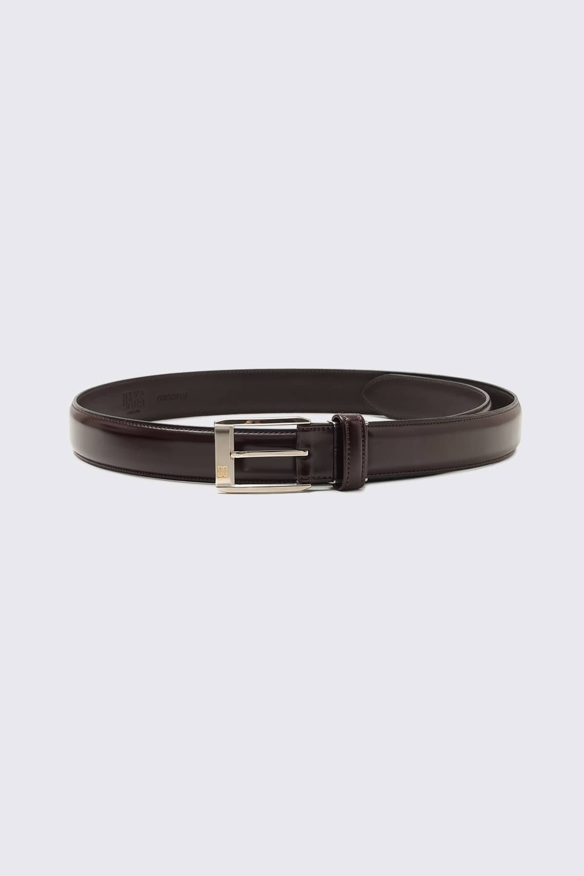 磨き上げられたコードバン特有の、深く美しいツヤと滑らかな質感が特徴。この格調高い光沢は、ビジネススーツをシャープに引き締めます。バックルは、装飾を抑えたシンプルなピンバックルを採用し、ベルト帯の美しさを際立たせます。裏面には「DAKS LONDON」のロゴが刻印。フォーマルからビジネスまで、幅広いシーンで品格を保つ、永く愛用できる逸品です。